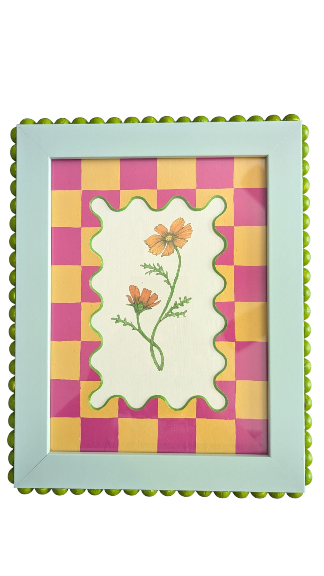 This handmade abstract frame, inspired by Cecilia Beaux, features a stunning small cosmos drawing. Known for her vibrant use of color and playful, bold designs, Beaux’s work often combines color and shape in exciting ways. The bright, abstract frame complements the floral illustration with a modern, energetic touch, and its versatile design allows it to be displayed both hung on the wall or standing alone as a statement piece.