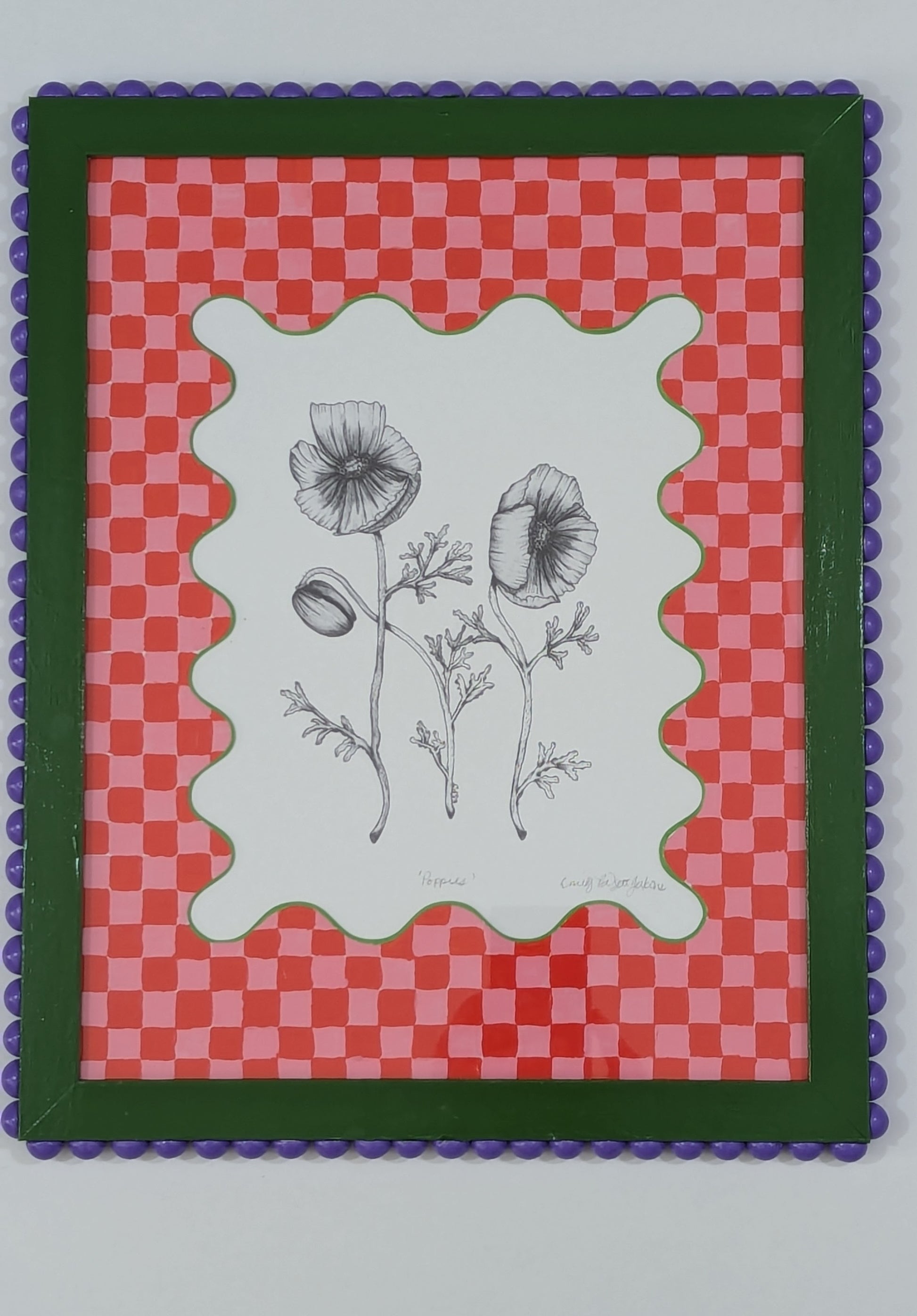 Frame measures 13 inches wide and 15.5 inches long. Frame is painted with acrylic paint and sealed. Print is signed by the artist and is an ink and pen drawing of a poppies.