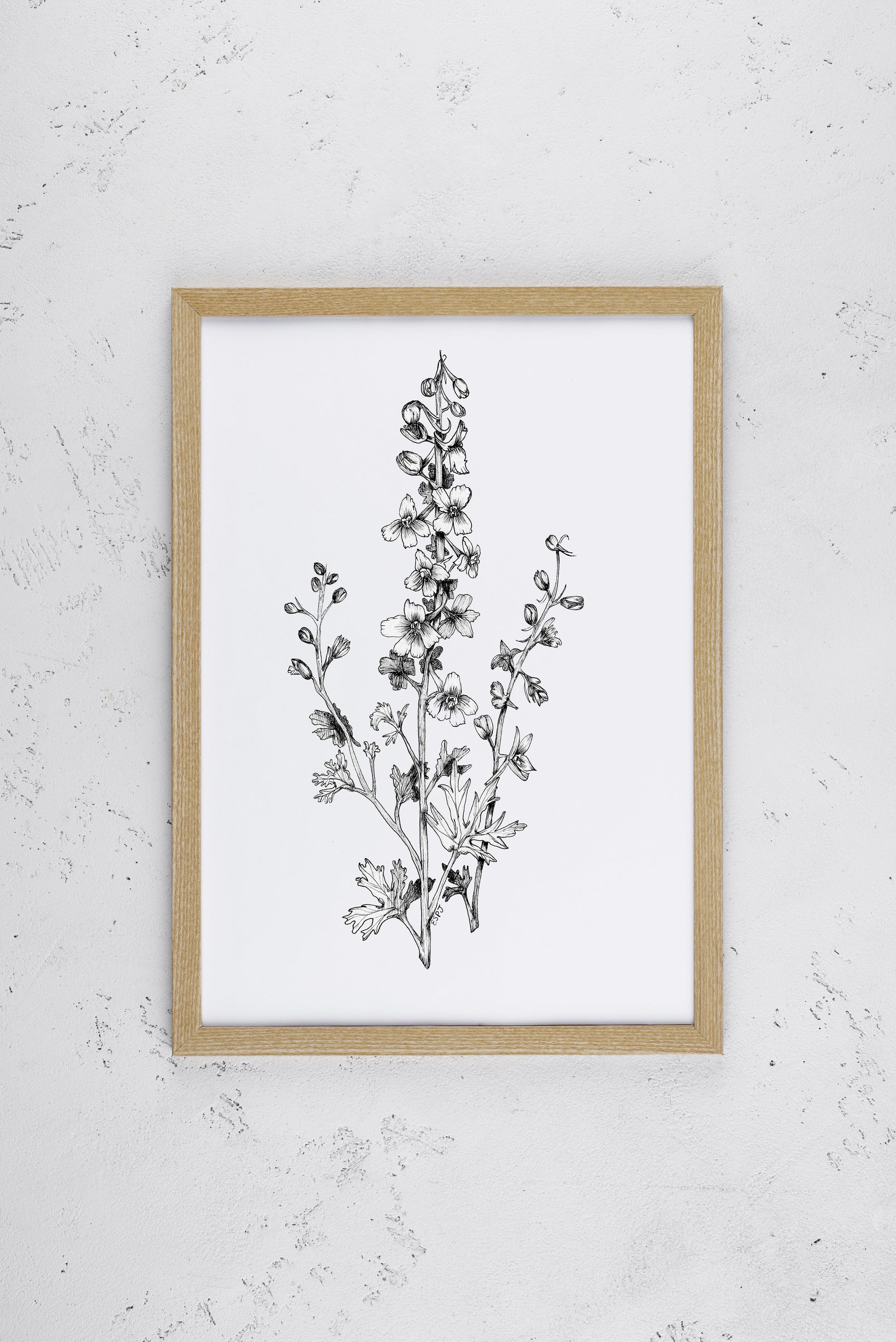 Delve into the enchanting world of larkspurs with this stunning pen and ink print. Each meticulous line brings the graceful blooms to life, showcasing their unique shapes and delicate details. This artwork captures the essence of summer's charm, making it a perfect addition to any art collection or home decor. Celebrate nature's beauty and invite a sense of tranquility and elegance into your space with this captivating piece. Larkspurs are the birth flower for the Month of July, and represent lightness, pure fun, and the desire to be humorous.