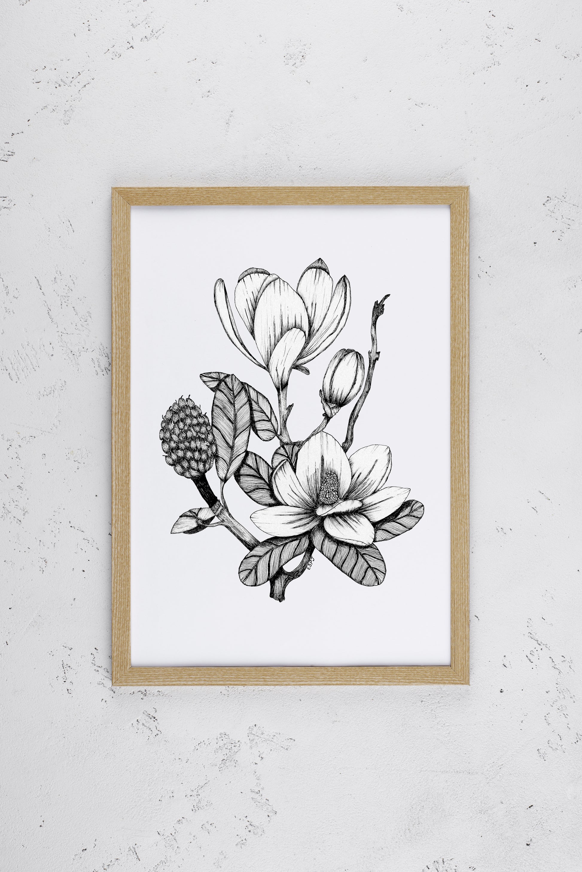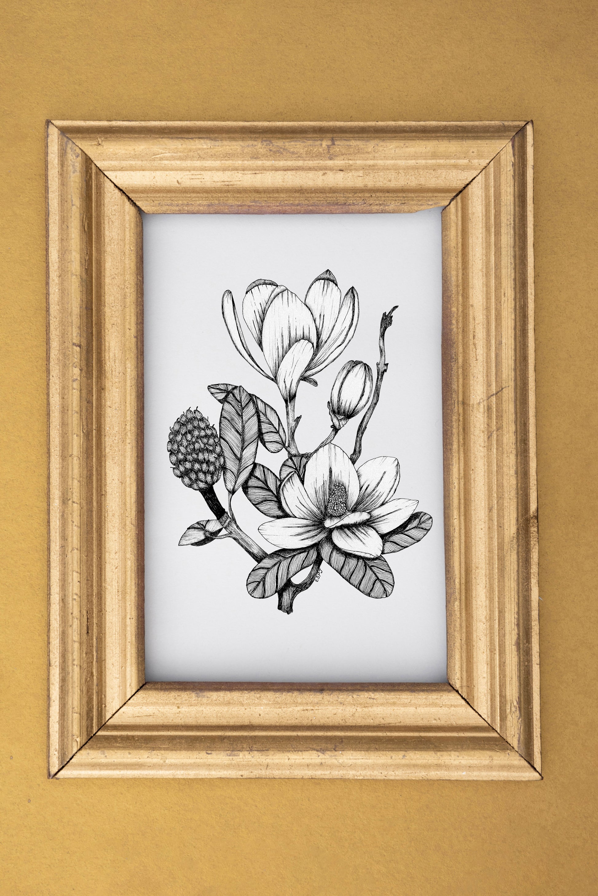 This print of a pen and ink drawing beautifully portrays the grandeur of a magnolia in exquisite detail. With its bold, sweeping lines and intricate shading, the artwork captures the full, luminous blossoms and glossy leaves of the magnolia tree. This drawing celebrates the magnolia's timeless grace and adds a touch of classic sophistication to any space.Magnolias symbolize luck and stability. This Grande Dame of the South would be the perfect piece for any home. Magnolias are also the birth flower for the month of August.