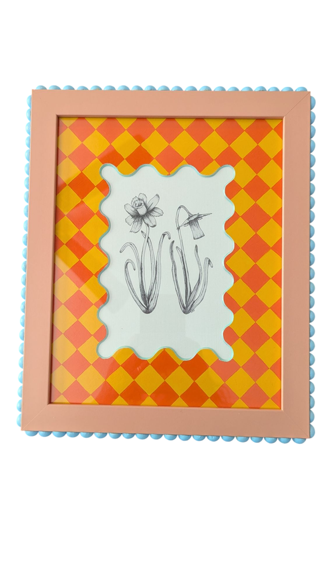 Frame measures 10 inches wide and 12 inches long. Frame is painted with acrylic paint and sealed. Print is an ink and pen drawing of a Daffodils.